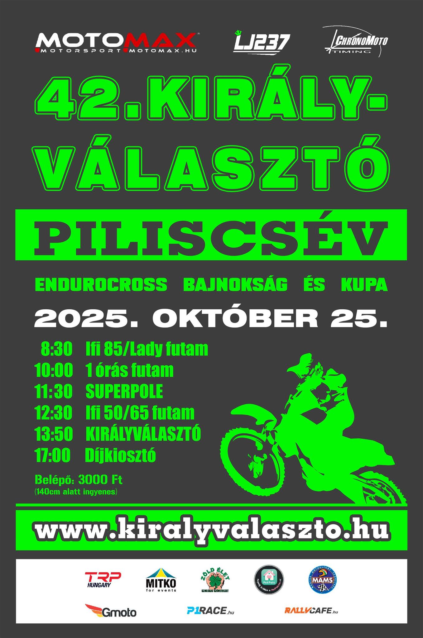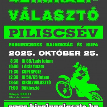 A Királyválasztó és Piliscsév neve több mint négy évtizede összeforrt a magyar terepmotoros kultúrában. A Motomax csapata és az alapító, Lantos József vezetésével idén is látványos futamokkal készülnek: a napot a junior versenyzők indítják, majd jön az egyórás küzdelem a trónkövetelők, elektro riderek és szuperveteránok számára.